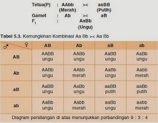 menghasilkan fenotip dengan perbandingan bunga ungu : merah : putih = 9 :